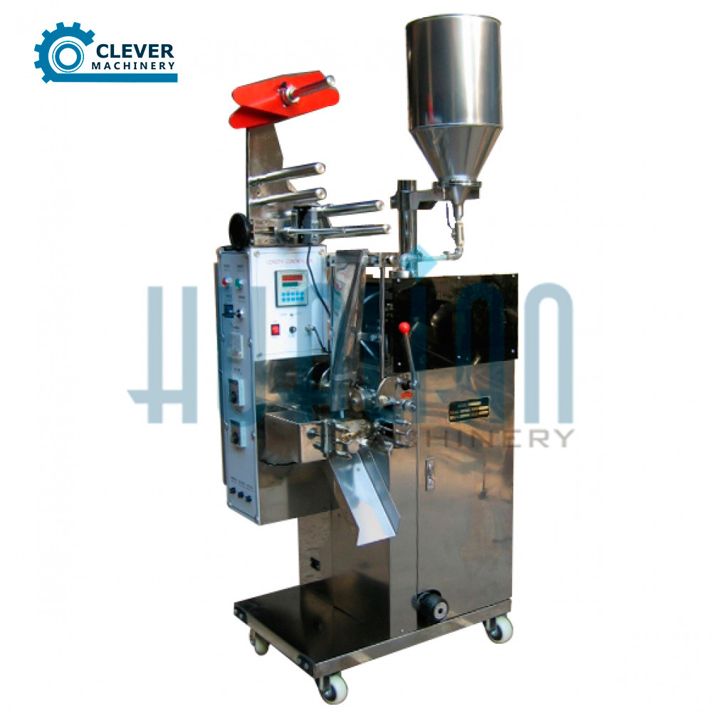 Машина розроблена для пакування рідких продуктів у м'які пакети з дозуванням продукту від 20-100 мл. Максимальний розмір пакета: довжина 150 мм і ширина 100 мм. Протягування плівки виконується за допомогою роликів-запаювачів, якими керує PLC контролер, що так само дає змогу встановлювати потрібну довжину пакета через інтерфейс контролера. Дозування рідини відбувається з витратного бункера, через електромагнітний клапан, завдяки своїй вазі (самотеком).